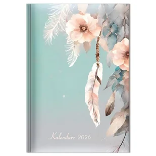 Kalendarz 2026 tygodniowy A5 Piórko boho SK1. Kalendarz. Format: A5 - 13,5 x 20 cm, 144 stronyUkład: 1 tydzień na stronie, druga strona notesDruk, papier: 2 kolory, papier 80 gm2 w kolorze białymKalendarium: w języku polskim, angielskim, niemieckim, numeracja tygodni, podwójne imieninyOprawa: