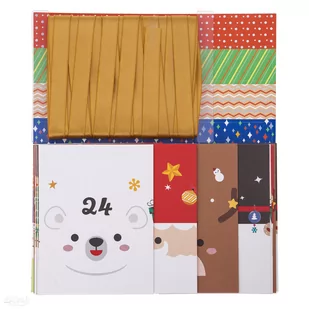 W zestawie znajdziesz 24 pudełeczka z uroczymi wzorami Mikołajów, reniferów, bałwanków i misiów polarnych, ozdobne naklejki w różnych kolorach, służące do zamknięcia opakowań oraz złota wstążeczka do wykonania zawieszek. Możesz też przeciągnąć całą wstążeczkę przez wszystkie pudełeczka i stworzyć z nich duży, wiszący kalendarz.
