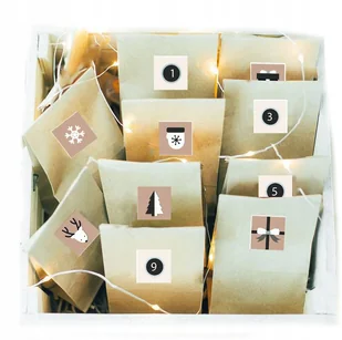 Kalendarz Adwentowy torebki na prezenty, słodycze eco 25 szt Torebki papierowe w kolorze brązowym z papieru eco Zestaw zawiera 25 torebek oraz arkusz z 25 sz...