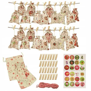 Kalendarz adwentowy DIY – zestaw 24 woreczków Wprowadź do swojego domu magię świąt dzięki ręcznie kompletowanemu kalendarzowi adwentowemu w formie materiałow...
