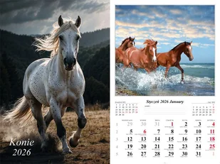 Kalendarz ścienny 2026 Konie. Kalendarz. Kalendarz wieloplanszowy ścienny 12 kart plus okładka pokryta lakierem Uv Miesiąc na stronie, spięty spiralą wraz z drucianą zawieszką Format 32x48 cm Kalendarium trójdzielne trzy miesiące na stronie, zaznaczone święta i Niedziele Handlowe Kalendarz. . .
