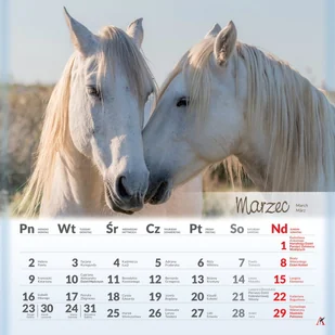 Kalendarz ścienny Konie 2026 OKŁADKA: lakierowana PLANSZE: 6 ROZMIAR: 33x33 cm UKŁAD: miesięczny, zaznaczone imieniny, święta DODATKI: na spirali z zawieszką...