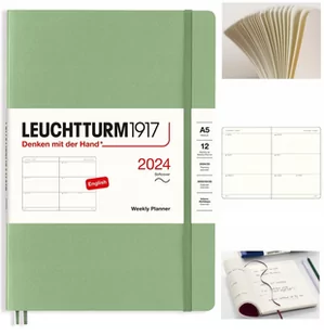 Planer tygodniowy poziomy - 12 miesięcy - 2024 - szałwiowy (Sage) Planer Leuchtturm1917 tygodniowy pionowy to wysokiej klasy produkt w rozmiarze A5 i miękkiej oprawie. Papier ma odcień kości słoniowej, jest bezkwasowy i bez optycznych wybielaczy, idealny do pisania piórem. Zaprojektowany, by pomóc wykorzystać każdy dzień i o niczym nie zapomnieć. Na każdej podwójnej stronie tydzień kalendarzowy. Planer tygodniowy rozpoczyna się od stycznia i obejmuje 12 miesięcy (od 01.2024 do 12.2024).