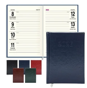 144- Dostępne kolory: czarny, granatowy, bordo, zielony, brąz- Oprawa: twarda skóropodobna + gąbka- Układ środka: 4 dni na jednej stronie, 3 dni na drugiej- Wewnątrz tasiemka do oznaczania stron.