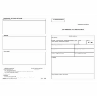 Przedmiotem transakcji jest druk Karta badania psychologicznego [Mz/Ps-11] opakowanie 100 sztuk papier offsetowy 80 g/m wymiary A3 (420 x 297 mm) karty złożone na pół - do formatu A4 1 karta składa się z 4 stron A4 Podstawa prawna stosowania druku Obwieszczenie Ministra Zdrowia z dnia 24 listopada 2021 r. w sprawie ogłoszenia jednolitego tekstu rozporządzenia Ministra Zdrowia w sprawie badań psychologicznych osób ubiegających się o uprawnienia do kierowania pojazdami, kierowców oraz osób wykonujących pracę na stanowisku kierowcy. Dz. U. 2022 r. , poz 165 z późn. zm (załącznik nr 6) Zastosowanie: kartę badania stosuje się do udokumentowania z przeprowadzonego badania psychologicznego osoby ubiegającej się o uprawnienia do zawodowego kierowania pojazdami, pojazdami uprzywilejowanymi, wykonujących pracę instruktora nauki jazdy.