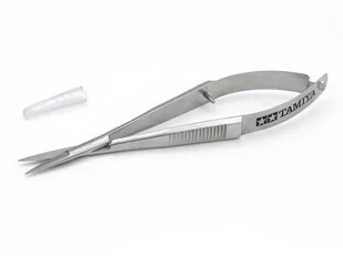 Nożyczki Tamiya 74157 HG Tweezer Grip Scissors [Precyzyjne nożyczki, których można wygodnie używać do wycinania śladów slajdów, w tym poliwęglanowy korpus Mini 4WD] Precyzyjna pinceta, którą można otwierać i zamykać, ściskając uchwyt opuszkami palców. Ręce trudno trafić w obrabiany przedmiot i możliwa jest delikatna praca. Jest nie tylko skuteczny do wycinania skomplikowanych detali poliwęglanowej obudowy Mini 4WD, ale jest również przydatny do wycinania drobnych naklejek, naklejek i taśmy maskującej. Kluczowe punkty to łatwość obsługi, którą może zapewnić tylko małe ostrze, oraz ostra ostrość, którą może zapewnić tylko ostrze ze stali nierdzewnej. Część sprężynowa jest nadrukowana z gwiazdą i logo Tamiya w kolorze czarnym.
