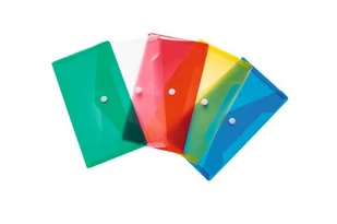 Plastikowe koperty zapinane na zatrzask. Wykonane z folii polipropylenowej. Półprzezroczyste. Rozmiar 22 x 12 cm (Dl). 5 sztuk. Kolory: zielony, biały, czerwony, żółty i niebieski. Na dokumenty, bilety, paragony, notatki.
