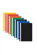 Przezroczysta przednia okładka, tylna kolorowa. Na grzbiecie papierowy pasek do opisu, zaokrąglone wąsy, Pojemność do 200 kartek. Opakowanie zbiorcze: 10 sztuk.