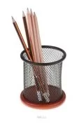 Ekskluzywny przybornik na eleganckie biurko, na długopisy i inne przybory do pisania. Wykonany z siatki metalowej na drewnianej podstawie z gumkami antypoślizgowymi pod spodem. Średnica podstawy 9,3 cm, wysokość 10 cm