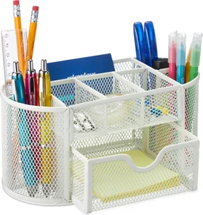 Stwórz porządek na swoim biurku dzięki temu metalowemu organizerowi biurowemu. Łączy on w sobie zalety przybornika na długopisy i organizera biurkowego w jednym systemie organizacji biurka w biurze lub w domu. Organizer na biurko o nowoczesnym, siatkowym designie posiada różnej wielkości przegródki na długopisy, pędzle i nożyczki. Dodatkowe materiały biurowe, takie jak igły do zszywacza, spinacze do papieru lub małe notatniki, można przechowywać w małej wysuwanej szufladzie. Organizer na biurko w szczegółach - Wymiary całkowite wys.