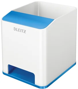 - do przechowywania nożyczek, otwieraczy do listów, przyborów do pisania lub kleju w sztyfcie na biurku- Telefon komórkowy można przechowywać w przedniej komorze Przybornik na długopisy Leitz WOW Sound Duo Colour.