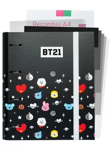 Segregator BT21 Segregator biurowy na dokumenty, rysunki, wycinki, kolekcje. Twarda tekturowa okładka o grubości 2 mm. Wnętrze wyłożone laminowanym papierem o gramaturze 150 g. Zamykany na kolorową gumkę. Wewnątrz zawiera 100 kartek A4 w kratkę, kopertę w dormacie A4 i komplet przekładek.