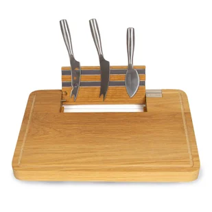 Nóż do serów półtwardych miękkich 17,5 cm - 1 szt. Nóż do smarowania 17,5 cm - 1 szt. Dlaczego warto$228 Zestaw do sera wykonany z solidnego drewna dębowego oraz wysokiej jakości stali nierdzewnej Stylowa dębowa deska do krojenia i serwowania przekąsek Deska posiada magnetyczną listwę oraz schowek na noże Noże doskonale poradzą sobie z pokrojeniem każdego rodzaju sera W skład kompletu wchodzi nóż do serów twardych o krótkim ostrzu, nóż do serów miękkich o klindze przypominającej ser z dziurami o rozwidlonym czubku oraz zaokrąglony nóż do smarowania Funkcjonalne, niezwykle komfortowe dębowe rękojeści Zestaw idealny na wszelkiego rodzaju imprezy i przyjęcia Nowoczesny, minimalistyczny design Komplet zapakowany w oryginalne opakowanie producenta, idealny pomysł na prezent Zaleca się mycie ręczne z dodatkiem łagodnych detergentów Gwarancja 2 lata Przed pierwszym użyciem deskę należy dobrze naoliwić i pozwolić by drewno chłonęło olej przez kilka dni. Czynność należy powtarzać co jakiś czas.