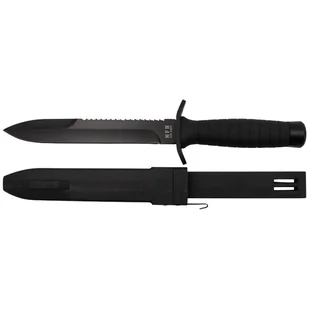 - Czernione ostrze z gładkim wykończeniem i piłą - Metalowy jelec z otworem do mocowania plastikowej pochwy - Gumowany, ryflowany uchwyt - Plastikowa osłona z metalową blokadą zapobiegającą wypadaniu noża z pochwy Pochwa posiada otwory umożliwiające jej przypięcie do paska oraz do uda Długość całkowita: