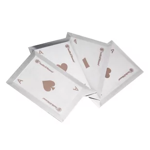 Zestaw kart do rzucania, wykonanych ze stali nierdzewnej. Posiadają wygrawerowane laserowo wzory przedstawiające asy, każdy innego koloru.