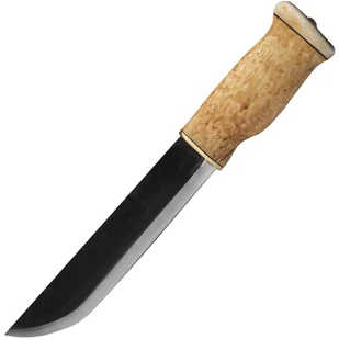 Gruba rękojeść jest znacznie spłaszczona po bokach, wykonana z kręconego brzozy, mosiądzu i rogu. Tradycyjna skórzana pochwa wykonana jest w stylu głębokiej kieszeni, z której nóż nie wypada tak łatwo. Za pomocą paska można go łatwo zawiesić na pasku, swobodne zawieszenie zapewnia, że nóż nie będzie przeszkadzał podczas poruszania się.