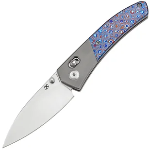 Łatwe otwieranie za pomocą podwójnych thumb stud, a całość blokowana jest mechanizmem Axis/Cross-bar lock. Dodatkowo, każdy Dako wyposażony jest w dodatkową sprężynę do dalszej regulacji. Rękojeść wykonana jest z połączenia Stonewashed tytanu i Timascus (znanego jako tytanowy damast, który ma unikalny efekt wizualny, podobny do damastu, ale z innym kontrastem kolorystycznym). Subtelnie zakrzywiona rękojeść poprawia ergonomię, oferując wygodny i pewny chwyt. Z klipsem do kieszeni dla prawo ręcznych użytkowników.