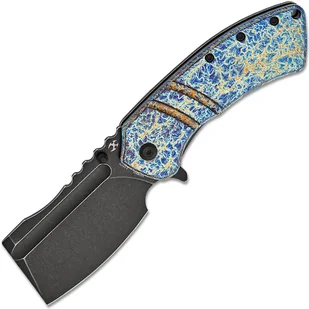 Płaski szlif i czarne wykończenie podkreślają surowy wygląd ostrza, jednocześnie zapewniając jego wydajność w różnych zadaniach. Konstrukcja cleaver oferuje znaczną krawędź tnącą, idealną zarówno do krojenia, jak i siekania. Rękojeść: Rękojeść wykonana jest z tytanu anodowanego w stylu "lightning strike", co nadaje jej unikalny, dynamiczny wygląd oraz doskonałą trwałość i wytrzymałość. Ergonomiczny kształt i anodowane wykończenie nie tylko czynią ją wizualnie atrakcyjną, ale także zapewniają wygodny i pewny chwyt podczas użytkowania. Locking Mechanism: