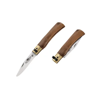 Old Bear Young – Nóż składany rozmiar S z rękojeścią z orzecha włoskiego i zaokrąglonym czubkiem Wykonany w Maniago, Włochy przez firmę Antonini, Old Bear Young to kompaktowy i bezpieczny nóż składany, idealny dla młodszych użytkowników lub do zadań wymagających ostrza bez ostrego czubka. Model w rozmiarze S posiada rękojeść z drewna orzecha włoskiego, ostrze ze stali nierdzewnej z zaokrąglonym czubkiem oraz mechanizm blokady typu slide-lock. Kluczowe cechy Ostrze: Ostrze typu clip point o długości 7,0 cm wykonane ze stali nierdzewnej 420, oferujące solidną odporność na korozję i łatwość ostrzenia. Wykończenie satin z zaokrąglonym czubkiem dla dodatkowego bezpieczeństwa.