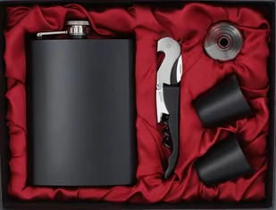 - Piersiówka 240 ml - 2 Kieliszki - Nóż kelnerski - Lejek Połączenie eleganckiego opakowania oraz wielu produktów w jednym sprawia, że idealnie nadaje się na prezent! Zalety Piersiówki: