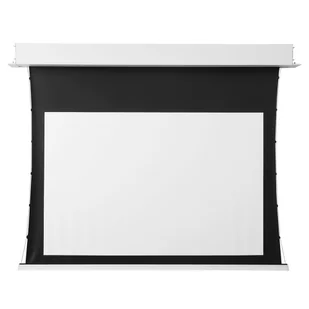 Elektrycznie rozwijany ekran z systemem napinaczy bocznych, czarną ramką dookoła powierzchni projekcyjnej, czarnym górnym pasem oraz powierzchnią projekcyjną Matt White HD Pro, zaprojektowany do zabudowy sufitowej.