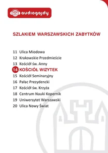Pozycja z cyklu ,,Szlakiem warszawskich zabytków". Wspaniały wirtualny przewodnik o ciekawych miejscach turystycznych w Warszawie, napisany przez licencjonowanego przewodnika z bogatą wiedzą i doświadczeniem. W cyklu przewodników audio, które ukazały się pod wspólnym ,,Szlakiem warszawskich zabytków" autorka poświęciła sporo miejsca kościołom w stolicy. To budowle z różnych epok, z którymi często wiążą się ważne wydarzenia historyczne. Na liście budowli sakralnych, których historię omówiła w swoim cyklu Ewa Chęć, wykwalifikowana i doświadczona przewodniczka, znalazł się również Kościół Wizytek. Dzięki temu, że w serii każdy odcinek dotyczy osobnego miejsca, a części przewodnika jest w sumie kilkadziesiąt, każdy może ułożyć własną trasę zwiedzania. Jeżeli zapragniemy zwiedzić właśnie budowle sakralne, mamy do dyspozycji między innymi nagrania dotyczące Kościoła Seminaryjnego, Kościoła św. Anny czy Cerkwi pod wezwaniem Marii Magdaleny. To okazja, aby poznać ich architekturę, historię, dowiedzieć się czegoś o czasach, w których powstały. Wygodna forma i rzetelne opracowanie sprawiają, że audiobooki możemy wykorzystać na etapie planów i samego zwiedzania, spacerując po Warszawie samodzielnie lub w towarzystwie. Cykl kilkudziesięciu nagrań ukazał się w wykonaniu Mateusza Błażkowa.