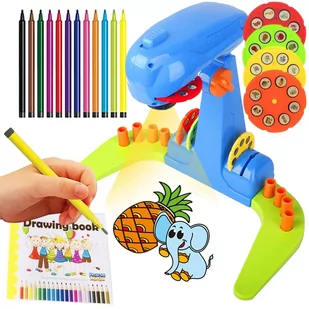 zwierzątka, zwierzątka morskie, pojazdy, owoce Łącznie 32 wzory do narysowania lub namalowania Regulowana wysokość rzutnika, dla regulacji wielkości obrazka 12 kolorowych mazaków w zestawie. Zeszyt z gładkimi kartkami. PROSTY W OBSŁUDZE, ZACHĘCA DO ZABAWY W zestawie znajdują się cztery krążki, które należy umieścić w otworze na czubku projektora. Po zapaleniu specjalnego światła na kartce pokaże się wybrany wzór do odrysowania. Aby przejść do kolejnego obrazka, wystarczy przesunąć krążek o jedno oczko w prawo lub w lewo.