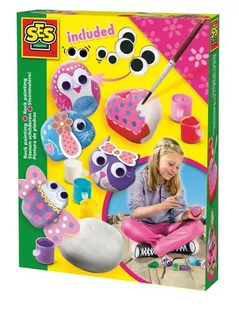 Kamyki do własnoręcznego pomalowania i ozdobienia. Dzięki oferowanemu zestawowi każde dziecko będzie mogło wykreować dowolny obrazek na kamieniu, czy doklejając oczka, uszka, skrzydełka, zamienić go w zwierzątko. Malowanie Kamieni to kreatywna zabawa pobudzająca dziecięcą wyobraźnię. Zestaw zawiera 5 kamyków, naklejki "ruszające się oczka", farby, klej, pędzelek.