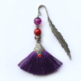 Elegancka etno zakładka do książki z agatem fioletowym i czerwonym koralem. Ozdobiona cyrkoniami. Agat fioletowy to kamień poszerzania świadomości duchowej. Antystresowy. Wspiera poczucie akceptacji i rów ...
