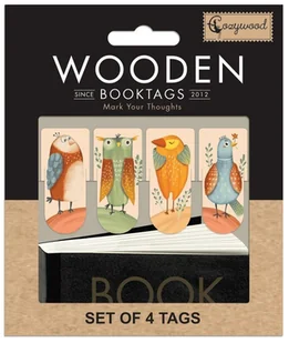 Cozywood Zakładki drewniane do książki Ptaszki. Gadżet. Zestaw 4 przepięknie ilustrowanych zakładek do książek, wykonanych z drewna Znaczniki są w 100% biodegradowalne, wykonane przy użyciu minimalnego nakładu energii, gazu i wody Wyprodukowane na Litwie