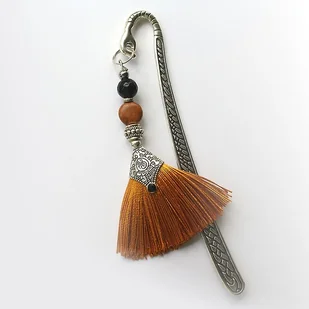 Elegancka etno zakładka do książki z fasetowanym onyksem, jaspisem i oryginalnym chwostem w odcieniu złota. Ozdobiona ręcznie. Jaspis i onyks wspierają razem odporność, wytrzymałość, dobrze przywództw ...