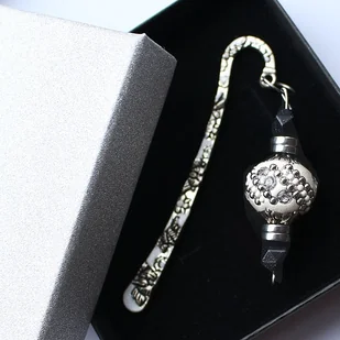 Elegancka mini zakładka do książki wykonana ręcznie, ozdobiona efektownym, bogato zdobionym koralikiem w odcieniu bieli i srebra oraz kostkami nocy Kairu i hematytem. Rodzaj produktu: zakładka do ksią ...