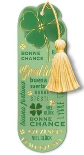 Złocona zakładka wykonana z grubego kartonu ozdobiona kolorowym chwostem.