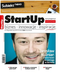 Najbardziej inspirujący do działania magazyn w Polsce! Magazyn skierowany dla młodych przedsiębiorców chcących zacząć przygodę z biznesem. Pismo ma na celu inspirować, dostarczać pomysłów, odkrywać talenty, łamać stereotypy i otwierać umysły. Nowoczesna szata graficzna, świetne teksty, wywiady z tymi, którzy już osiągnęli sukces, to tylko niektóre atuty StartUp Magazine. Spis treści: 1. Shorty 2. Znana twarz nie pomaga w biznesie 3.