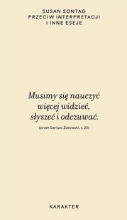 Zbiór głośnych esejów amerykańskiej intelektualistki. Opublikowany w 1966 roku, szybko stał się pozycją klasyczną i wywarł wielki wpływ na myślenie o współczesnej sztuce i kulturze. Sontag w oryginalny, a niekiedy i prowokacyjny jak na tamte czasy sposób pisze m. in. o twórczości Sartre’a, Ionesco i Lévi-Strausse’a, analizuje filmy Godarda i Bressona, podejmuje temat wyobrażenia katastrofy w filmach science fiction czy też zagadnienia współczesnej myśli religijnej. W tomie znalazły się najbardziej znane teksty Sontag – esej tytułowy oraz Zapiski o kampie, dowodzące jej niezwykłej wrażliwości na nowe zjawiska w kulturze.