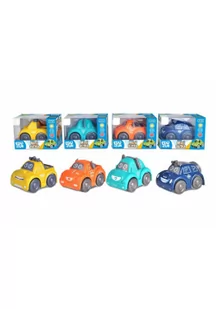 Dł. Auta: 8 cm., 4 wzory: morski garbus, pomarańczowe naprawcze, niebieskie policyjne, żółte policyjne, funkcje: napęd frykcja, wym. Opakowania: 12 x 8,5 x 7,5 cm., 3+