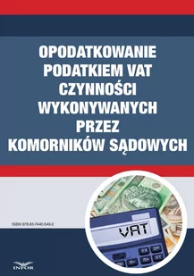 Publikacja zawiera pełną treść wyjaśnień MF w tej sprawie. Zostały w niej omówione problemy związane z określeniem: podmiotu będącego usługobiorcą momentu powstania obowiązku podatkowego podstawy opodatkowania zasad odliczania VAT naliczonego prawa do zwolnienia podmiotowego zasad rejestracji na potrzeby podatku zasad dokumentowania świadczonych usług zasad prowadzenia ewidencji VAT wypełniania deklaracji i płatności podatku W publikacji znajdują się również przygotowane przez MF odpowiedzi na najczęściej zadawane pytania w sprawie opodatkowania komorników sądowych.
