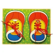 Buty do nauki wiązaniaDrewniana tabliczka z dziurkami, kolorowym rysunkiem przedstawiającym buty i sznurowadłami.Dzięki nim dzieci mogą uczyć się sznurowania przez zabawę.