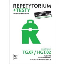 Repetytorium to kompendium wiedzy z kwalifikacji TG.07 i HGT.02. Krótko prezentuje najważniejsze informacje, w czytelny sposób przypomina istotne cechy surowców gastronomicznych, zwięźle opisuje technologie sporządzania potraw i napojów oraz zasady obowiązujące kucharza w pracy. Na początku każdego rozdziału uczeń znajdzie zestaw ważnych pojęć wprowadzający do tematu. Prócz części repetytoryjnej publikacja zawiera arkusz egzaminacyjny z egzaminu potwierdzającego kwalifikację TG.07, 4 testy po 40 pytań z odpowiedziami oraz 4 zadania praktyczne z kluczem oceniania. To niezwykle cenna pomoc w przygotowaniu do egzaminu, dostosowana językowo i merytorycznie do wieku odbiorcy.