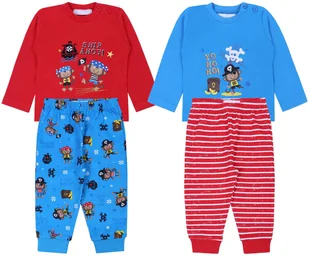 Komplet dwóch chłopięcych piżam z długim rękawem. Wykonane z miękkiego, miłego w dotyku materiału. Spodnie z gumką w pasie, przy nogawkach posiadają ściągacz...