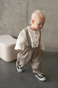Komplet lniany uszyty z lnu pranego z dodatkiem bawełny. Koszula w kolorze off white i baggy na szelkach w kolorze sand Koszula ma wygodny krój oversize, jest zapinana na kokosowe guziki, rękaw można pod ...