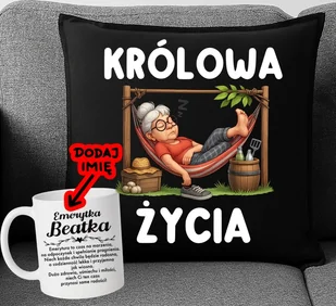 Prezent dla emerytki - poduszka oraz kubek z imieniem - KRÓLOWA ŻYCIA