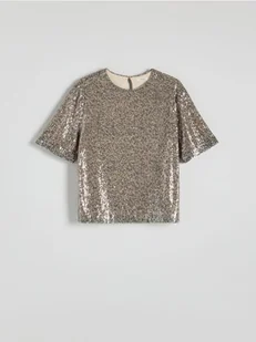 T-shirt o prostym kroju wykonany z elastycznej dzianiny wyszywanej cekinami.