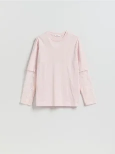 Reserved - T-shirt z koronkowymi rękawami - pastelowy róż