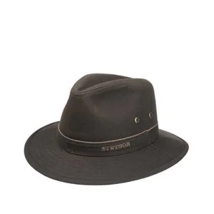 Elegancki kaszkiet o klasycznym wykończeniu Traveller - ze zniżonym rondem z przodu i z tyłu oraz potnikiem w tym samym kolorze, dodatkowo jest wzbogacony o mosiężne detale. Znany jest również jako kapelusz australijski. Ten letni elegancki model Traveller jest wykonany z czystej angielskiej woskowanej bawełny. Nadaje jej to teksturę podobną do kurtek Barbour. Krótko mówiąc, odznaka jakości.