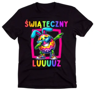 Świąteczna koszulka Wielkanocna - Świąteczny luz Czarna bawełniana koszulka na Święta Wielkanocne z zabawnym nadrukiem to idealny wybór dla każdego, kto chce dodać odrobinę humoru do świątecznych stylizacji. Wykonana z wysokiej jakości bawełny, zapewnia wygodę i trwałość. Dostępna w wersji męskiej, damskiej oraz dziecięcej, dzięki czemu cała rodzina może stworzyć spójny, świąteczny look. Świetnie sprawdzi się jako prezent lub element wesołej, wielkanocnej atmosfery Materiał: bawełna