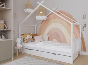 Łóżeczko Domek D6s w rozmiarze 90x200 cm ze stelażem i dwiema szufladami w kolorze białym - Spełnienie Marzeń Twojego Dziecka Witaj w świecie wyjątkowego komfortu i magii dzieciństwa! Łóżeczko Domek D6s to nie tylko miejsce do spania i odpoczynku, ale także spełnienie marzeń Twojego malucha o własnym małym domku. Zestawiliśmy w nim funkcjonalność, design i bezpieczeństwo, aby stworzyć idealne miejsce, gdzie Twoje dziecko będzie mogło cieszyć się spokojnym snem, pełnym marzeń i przygód. Łóżko dziecięce Domek D6s z szufladami Drewniana Konstrukcja - Wykonane z solidnego drewna sosnowego, łóżeczko gwarantuje trwałość i stabilność na wiele lat. Jego bryła nie tylko stanowi piękną dekorację w pokoju dziecięcym, ale również zapewnia komfortowy i zdrowy sen dla Twojego malucha. Bezpieczeństwo przede wszystkim - Dbając o spokojny sen i bezpieczeństwo Twojego dziecka, łóżko zostało wyposażone w płotek umieszczony na przednim blacie oraz zagłówku.