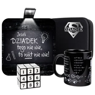 - Skład zestawu: kubek, lampka, etui, kostka, wkładka. Gotowy do wręczenia na prezent bez konieczności dodatkowego pakowania. Napis na wkładce: Jeżeli DZIADEK tego nie wie, to nikt nie wie! Produkt w polskiej wersji językowej. Kubek:Nadruk wokół całego produktu. Materiał: ceramika. Wymiary: 9,5 cm (wysokość), 300 ml (pojemność). Można myć w zmywarce. Można używać w mikrofalówce. Nadaje się do kontaktu z żywnością. Lampka:Wymiary: 20,5 cm (długość), 4 cm (szerokość). Etui:Materiał: EVA. Etui wykonane z twardego i solidnego tworzywa, które chroni jego zawartość przed uszkodzeniem. Lekka i kompaktowa konstrukcja ułatwia pakowanie etui do torby, plecaka lub walizki. Wymiary: 12 cm (wysokość), 20 cm (długość), 20 cm (szerokość). Kostka:Materiał: plastik. Wymiary: 5,7 cm (wysokość), 5,7 cm (długość), 5,7 cm (szerokość). OSTRZEŻENIA:Baterie