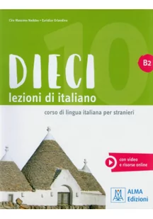 Dieci to kurs języka włoskiego dla obcokrajowców podzielony na 4 poziomy (A1, A2, B1, B2). Składa się z 10 rozdziałów podzielonych na dwustronicowe lekcje. Podręcznik Dieci B2 zawiera: 10-odcinkowy kurs wideo, gramatykę, ilustrowany słownik, ćwiczenia, komiksy “VIVERE E PENSARE ALL’ITALIANA”, teksty rozwijające umiejętność wypowiadania się, interesujące odsłuchy.