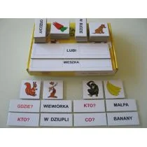 dwóch oddzielnych zestawów ćwiczeniowych (Gdzie mieszka$338 i Co lubi$339)Zestawy te służą do nauki dopasowywania elementów w postaci schematu do obrazka, odpowiedzi obrazkiem lub etykietką na pytania np.:
